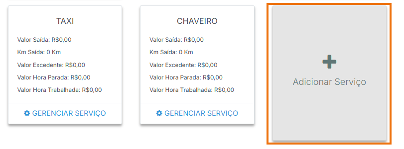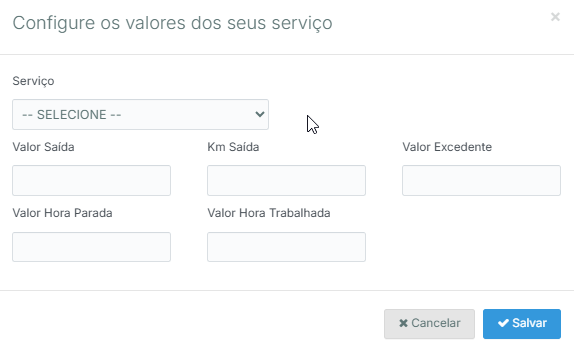 Na tela de cadastro, será necessário preencher algumas informações. Primeiro, selecione o Serviço, escolhendo na lista o tipo de serviço que você oferece. Em seguida, informe o Valor de Saída, que é o valor cobrado para sair da sua base até o local do atendimento.