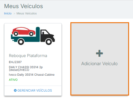 Caso você já tenha veículos cadastrados e deseje adicionar um novo, o sistema primeiro exibirá a tela de consulta de veículos. Nessa tela, basta clicar em “Adicionar veículo” para iniciar o novo cadastro.
