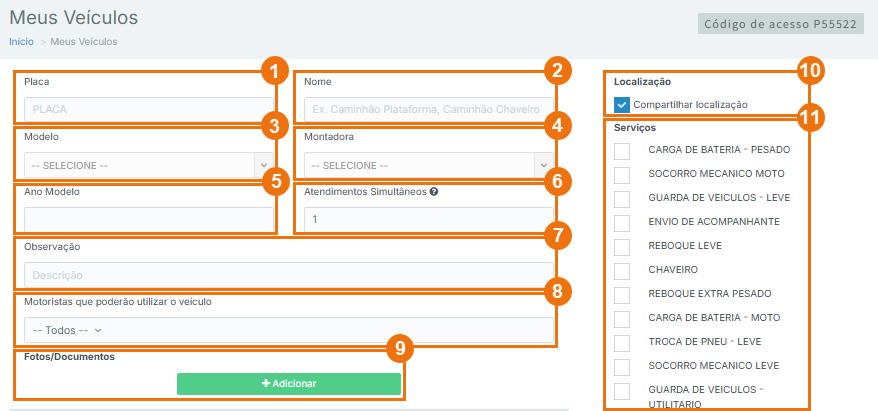 - Atendimentos simultâneos: informe quantos atendimentos esse veículo consegue realizar ao mesmo tempo. Exemplo: se o guincho consegue transportar dois veículos, é possível realizar dois atendimentos simultaneamente.