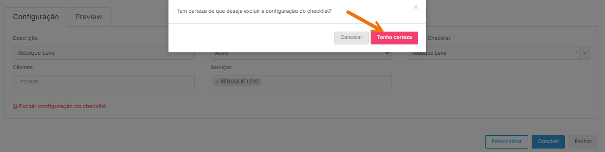 Para excluir uma configuração ou personalização de checklist, siga os passos abaixo: