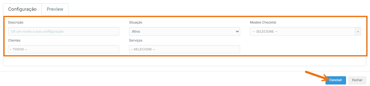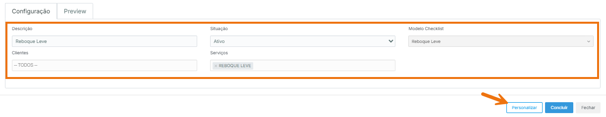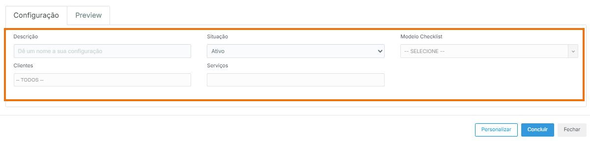 Depois disso, preencha as seguintes informações: nome da configuração, clientes que irão visualizar o checklist, serviços relacionados e o modelo de checklist. Depois disso, clique em “Personalizar” para começar a montar o checklist.