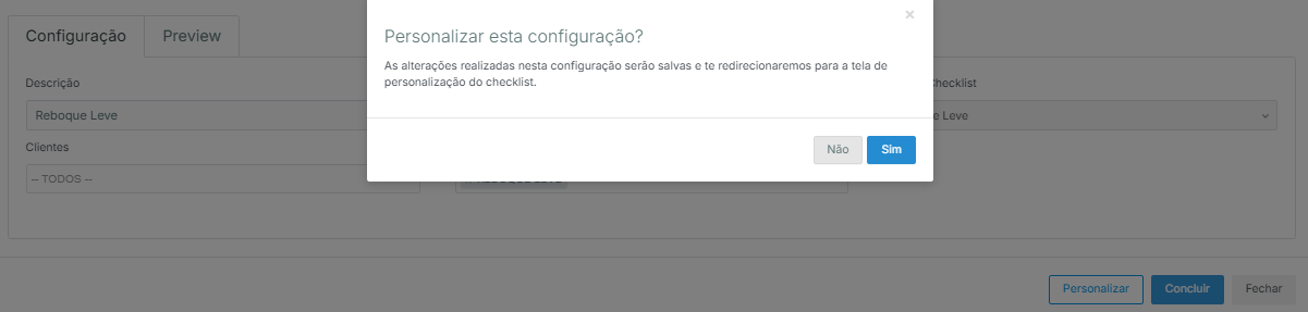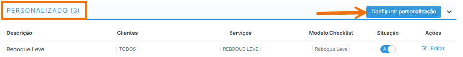 Se preferir montar seu checklist totalmente personalizado, acesse: Cadastros Auxiliares > Checklist > Configuração, vá até a aba “Personalizado” e clique em “Configurar Personalização”.