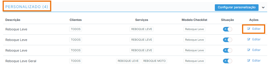 Depois disso, você poderá alterar o nome, definir a situação (ativo ou inativo), selecionar os clientes, escolher os serviços e definir o modelo de checklist. Após configurar essas informações, clique em “Personalizar”. Você será direcionado para a tela onde poderá editar os itens do checklist.