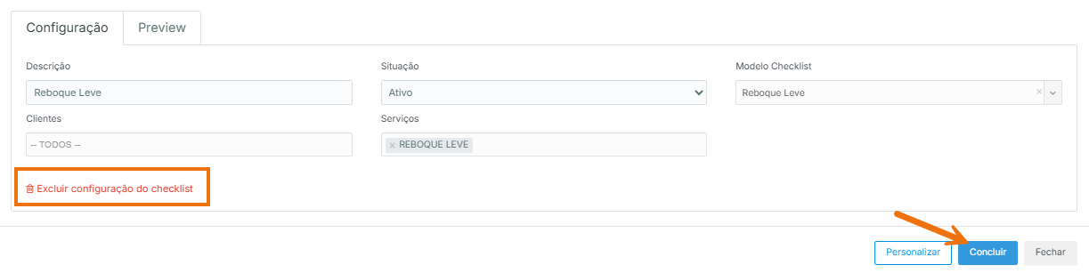 Na parte inferior da tela, clique em “Excluir configuração do checklist” e depois no botão "Concluir"